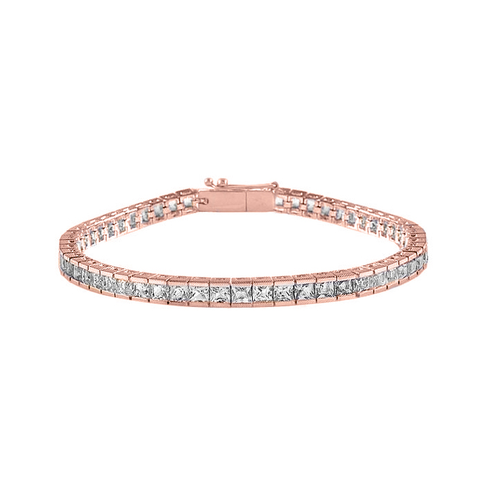 Tennis bracelet bears 5 carat princess- cut diamonds which are arranged over a trendy and sleek 14K rose gold row. This diamond bracelet is glorious piece jewelry and you can wear it to your next formal and casual occasion. Features