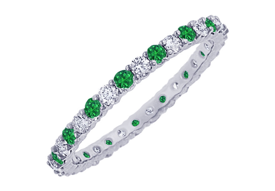 A fashionable circle eternity bangle surrounded with alternate sparkling brilliant-cut round diamonds & emeralds are beautifully prong-set. Made in rich platinum & has a total gem weight (TGW) of 10.00 carat. Features